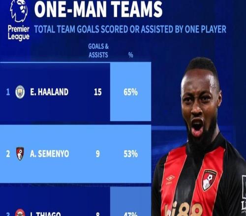 塞门约本赛季参与进球率英超第二,上赛季至今参与进球数第六