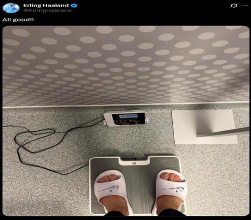 作为回应,曼城前锋哈兰德在社交媒体上发布了一张自己站在体重秤上的照片,并配文“一切都很好!!”